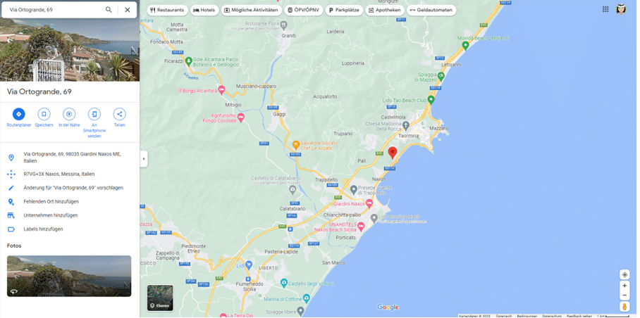 Die Casa Limoni liegt auf einem Hügel im Norden von Giardini Naxos an den Ausläufern des Etna. Der Bahnof Taormina-Giardini liegt rund 15 Minuten, der nächstgelegene Strand ca. 8 Minuten zu Fuß entfernt. Einen kostenlosen Parkplatz finden Sie direkt auf der Straße vor dem Eingang. Nach Taormina sind es 5 Minuten mit dem Auto (Parkmöglichkeit: Parcheggio Porto Catania) bzw. gibt es eine Busverbindung (Haltestelle ca. 10 Minuten zu Fuß).
