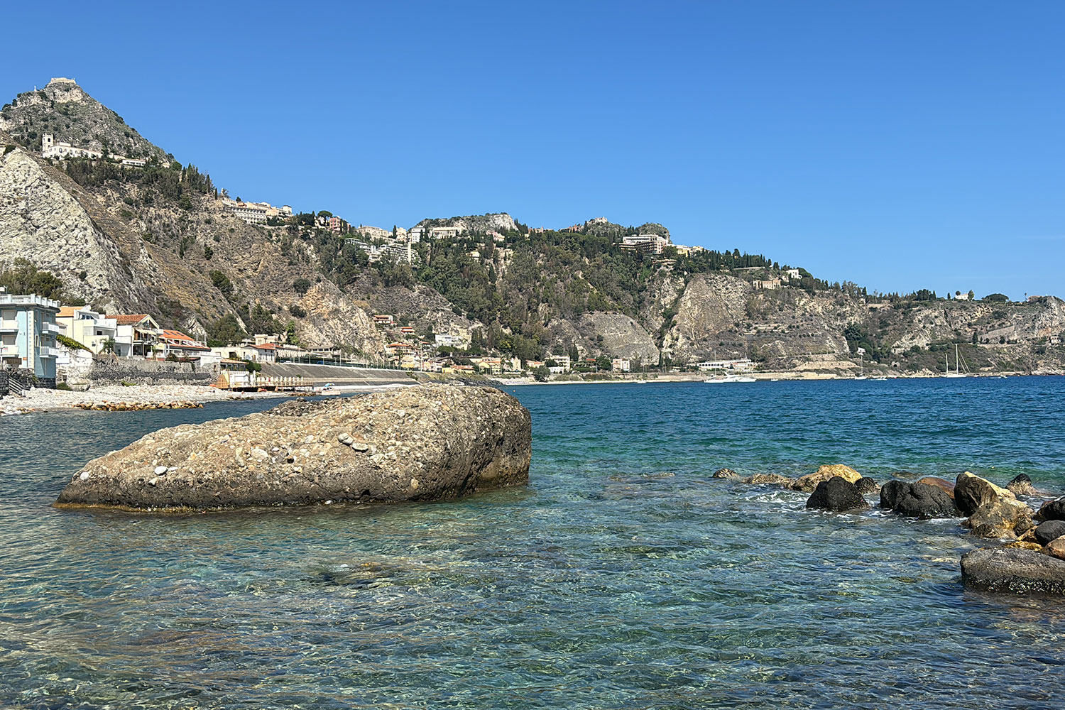 In und um Giardini-Naxos finden Sie jede Art von Strand. Einen breiten Sandstrand mit sämtlicher Infrastruktur, insb. für kleinere Kinder, ist der „Lido di Naxos“ im Ortszentrum (ca. 2 km entfernt). Der zur Casa Limoni nächste Strand (ca. 8 Gehminuten) ist der Kiesel- und Felsstrand die Küstenstraße „Lungomare“ entlang. Er ist vor allem bei Einheimischen beliebt und daher wochentags wenig frequentiert. Sie können an fast jeder Stelle ins Wasser, das sich dort durch seine Klarheit auszeichnet und zum Schnorcheln einlädt; es gibt aber kaum Infrastruktur. Einer von Siziliens bekanntesten Stränden ist die „Isola Bella“ nördlich von Giardini. Sie erreichen diese in ca. 10 Autominuten oder mit dem öffentlichen Bus vom „Lungomare“ (Station gegenüber dem Restaurant „Portacciolo“). Wenn Sie mit dem Auto fahren, nutzen Sie am besten den Parkplatz der Seilbahn nach Taormina.